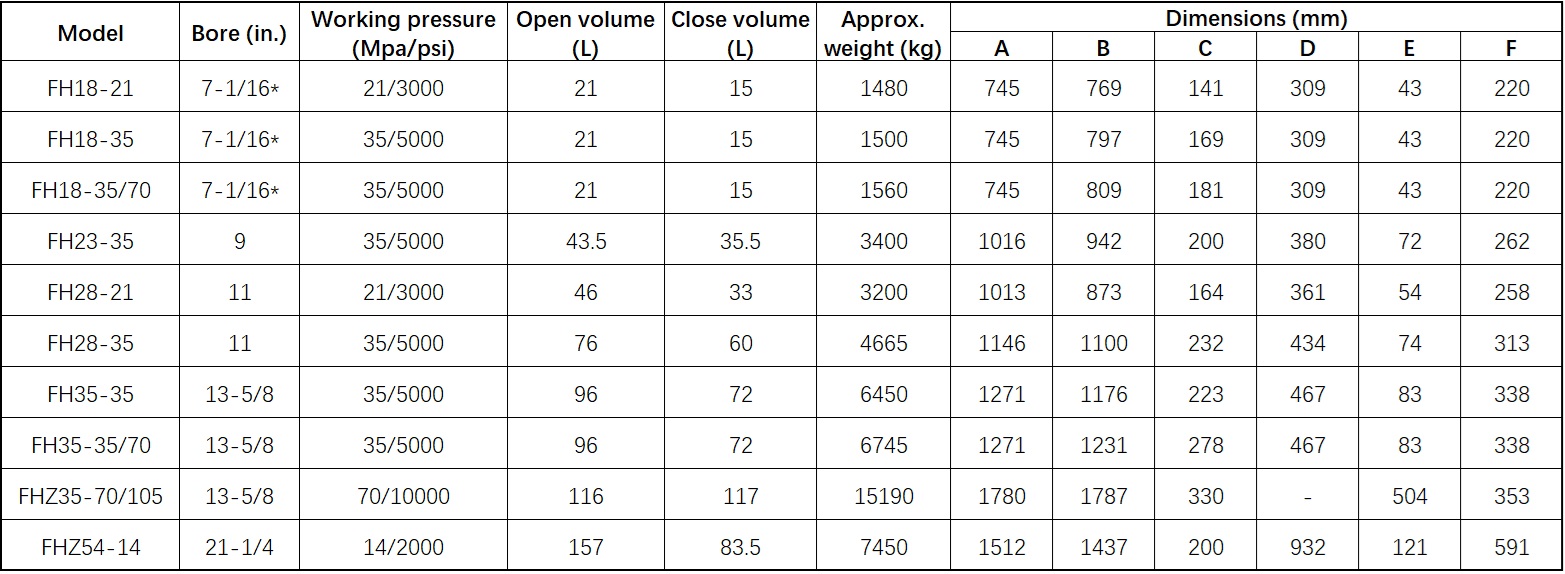 FH--spherical annular BOP; FHZ--taper annular BOP